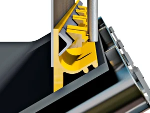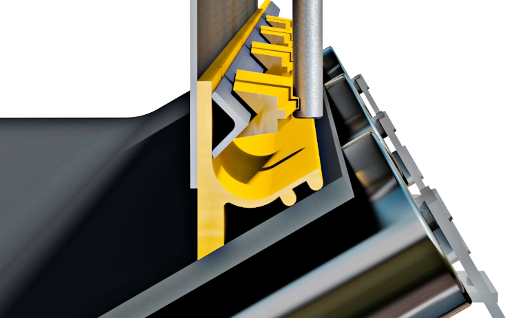 Deze labyrinth afdichting uit hoog slijtvast polyurethane dicht de zijkant van de transportband af en voorkomt zo vervuiling en stofvorming.